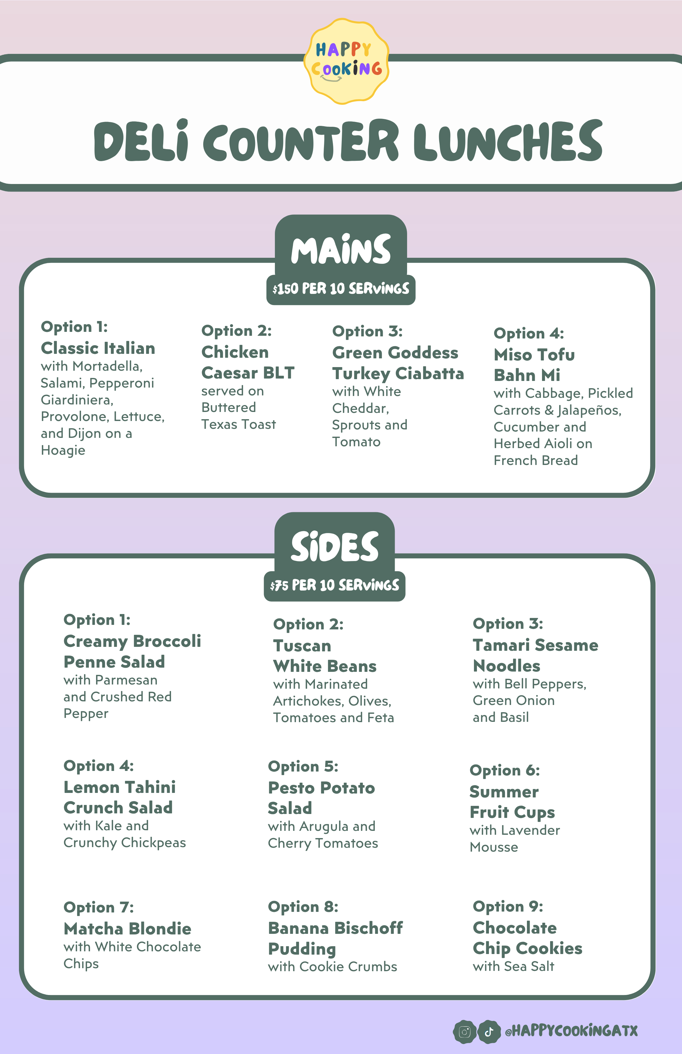 Select your desired dishes from our tried and true options to create your catered meal. Want to mix-and-match between cuisines? Make a note in your booking form on what you’d like to sub out and we’ll make it happen!