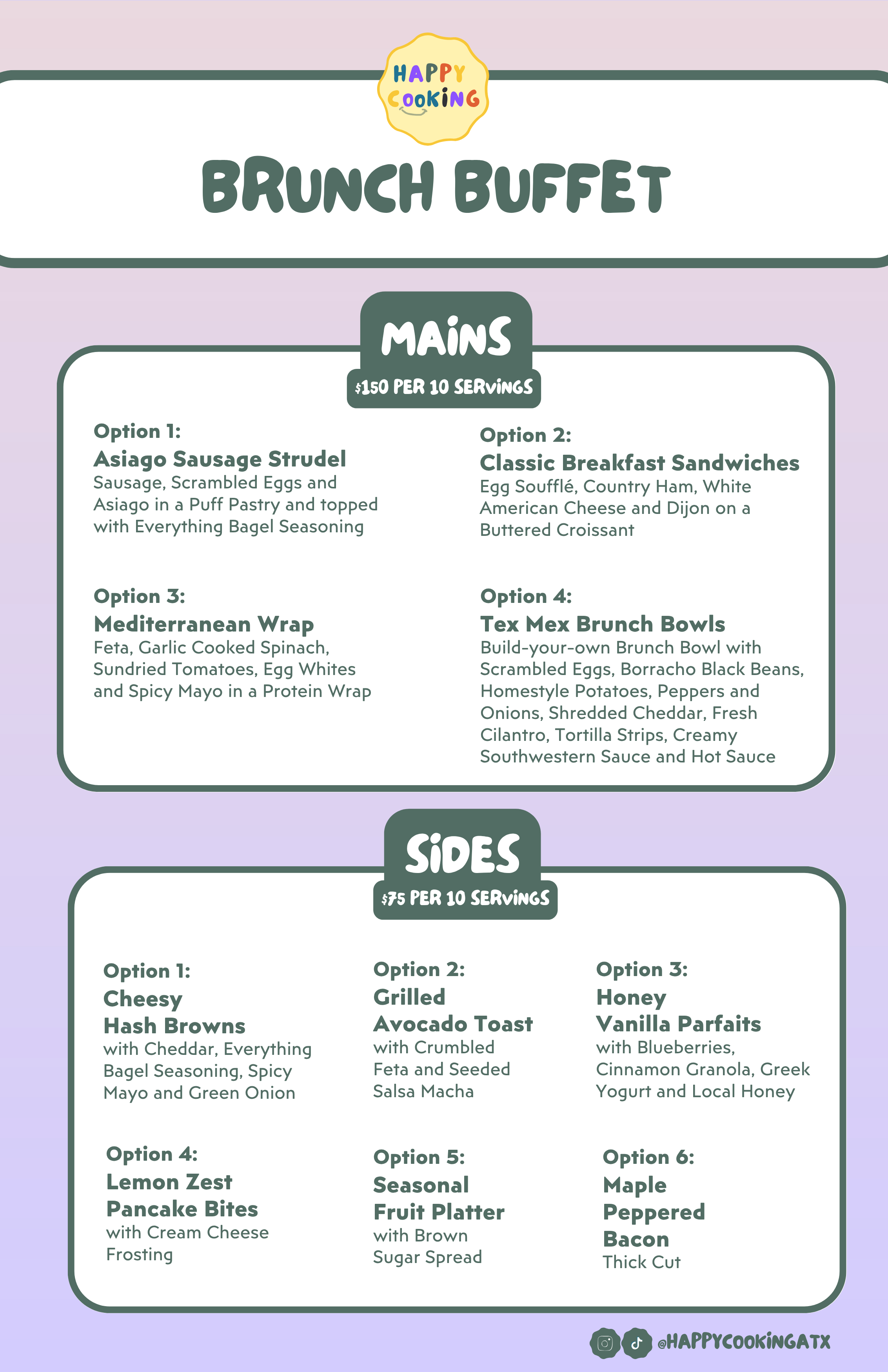 Choose your add-ons like sterno sets and/or a tablescape service to uplevel your buffet’s aesthetic.