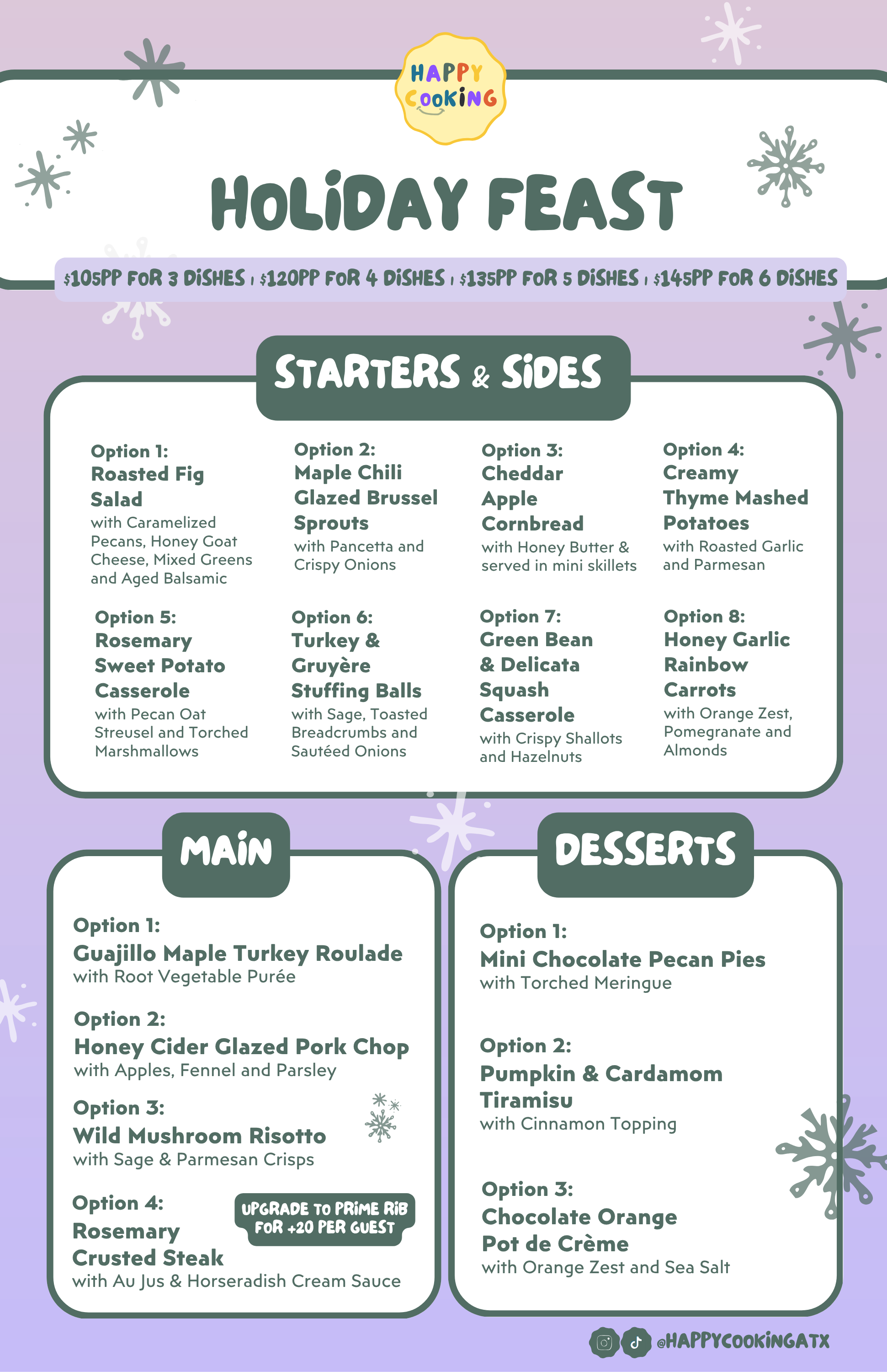 Yep! Feel free to build your own menu by mixing our holiday menus with any of the dishes from our dinner party or catering offerings. Book your holiday service and then email us at hello@happycookingatx.com with your selections from the dinner party/catering menus, and we’ll update your menu selections on the back end.